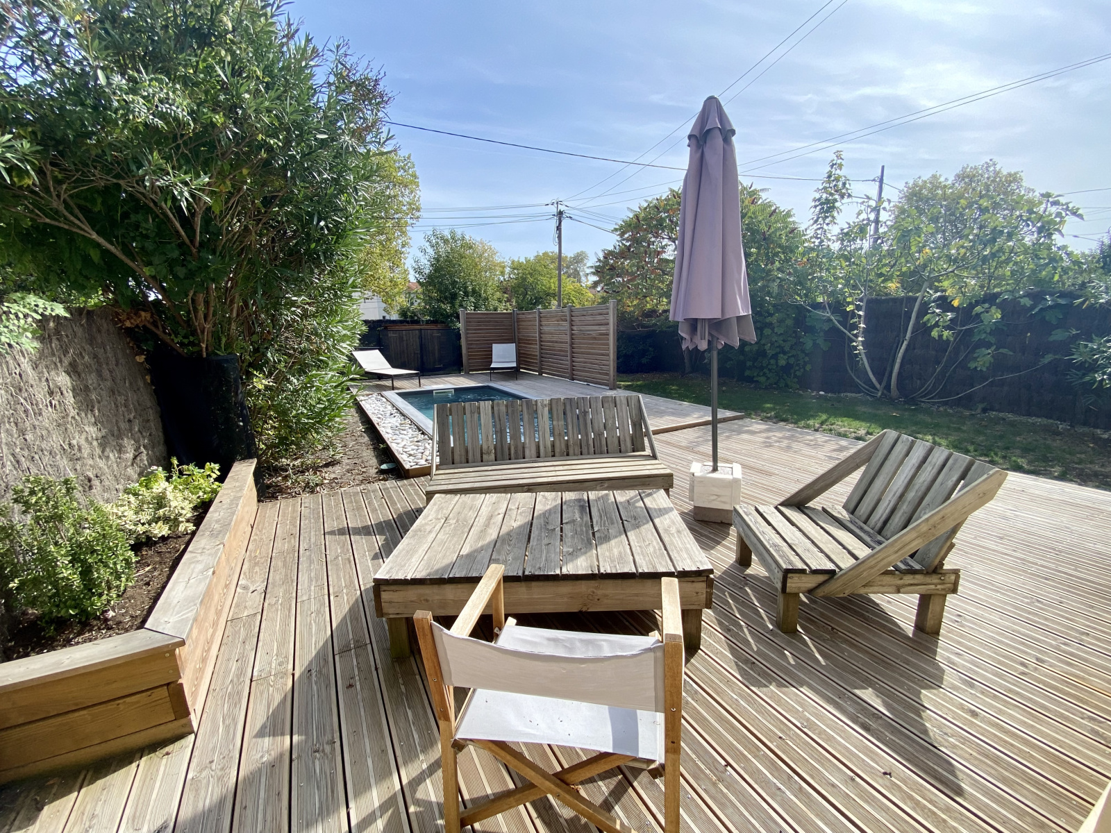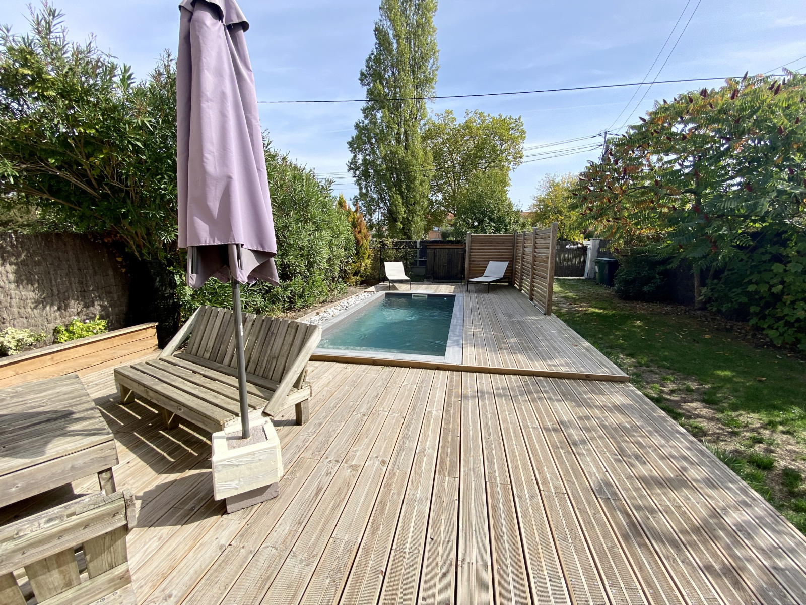 EXCLUSIVITE Bruges, parc Treulon, à vendre, maison de 5 pièces principales entièrement rénovée comprenant au rez de chaussée : une entrée, une belle pièce de vie traversante de 45 m2 avec un accès direct sur les deux terrasses et la piscine, une cuisine entièrement équipée, un cellier et un toilette. A l'étage : 3 chambres avec placards, une salle de bains avec toilette et un dégagement. Terrain de 371m2 à l'abri des regards avec une dépendance. Quartier, prestations et luminosité sauront vous séduire.