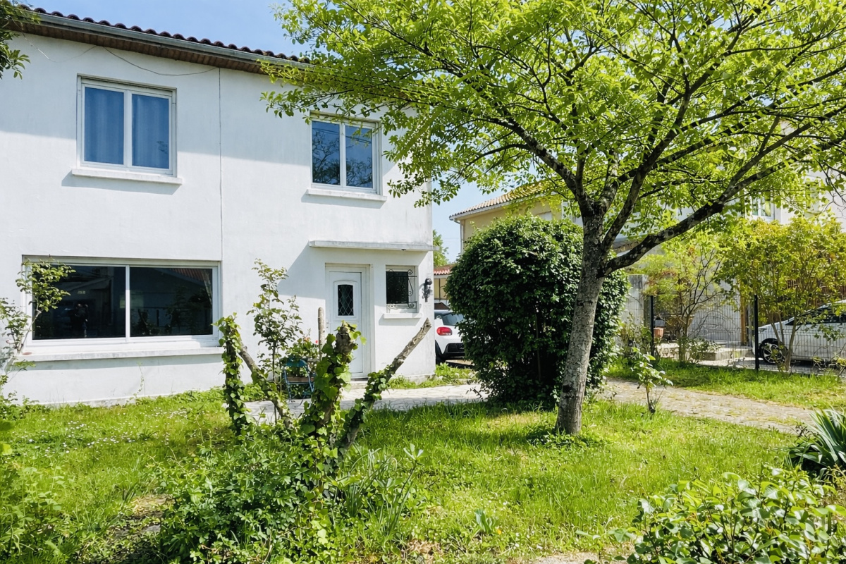 EXCLUSIVITE Bruges, parc Treulon, à vendre, maison mitoyenne d'un coté de 6 pièces principales exposée Est-Sud-Ouest comprenant au rez de chaussée : une entrée, un séjour avec un poêle et sa cuisine ouverte, un cellier avec un point d'eau, une chambre et un toilette. A l'étage : 3 chambres avec placards, un bureau, une grande salle de bains avec douche, un toilette et un dégagement. Terrain de 480m2 à l'abri des regards avec un garage double de 42m2. Quartier, calme et luminosité sauront vous séduire.